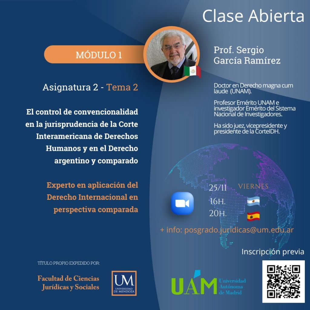 En el marco de la segunda edición del título de Experto en la aplicación del Derecho internacional en perspectiva comparada, se brindará este viernes 25 de noviembre a las 16 hs. (Argentina), 20 hs. (España) una clase abierta, en modalidad virtual, a cargo del profesor Sergio García Ramírez, sobre «El control de convencionalidad en la jurisprudencia de la Corte IDH».