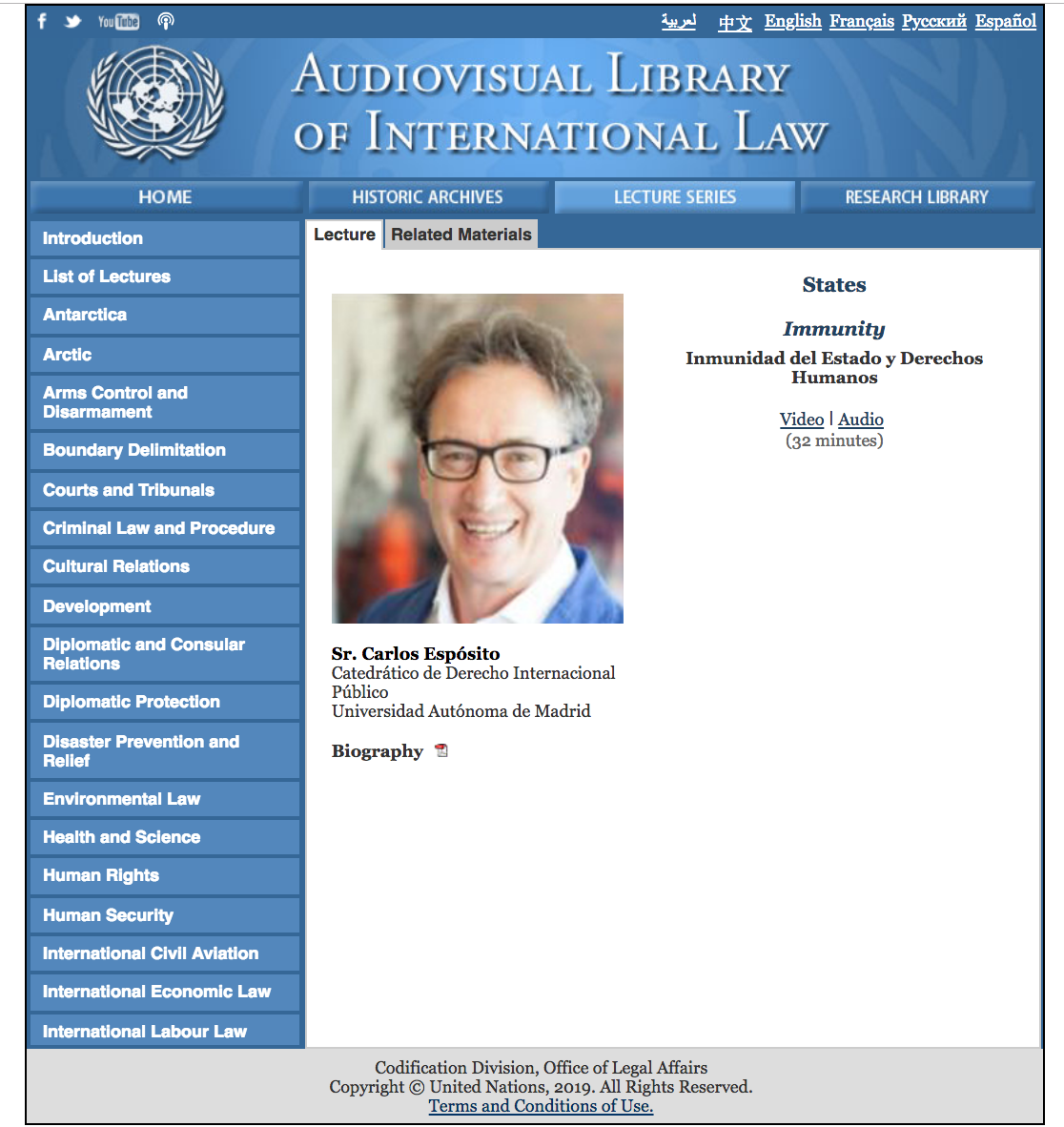 Mi conferencia sobre “Inmunidad del Estado y Derechos Humanos” está disponible en la Biblioteca Audiovisual de Derecho Internacional de las Naciones Unidas. En este vínculo pueden encontrar la conferencia y otros materiales relacionados con su contenido: http://legal.un.org/avl/ls/Espósito_S.html. Agradezco al equipo de la Biblioteca Audiovisual de Derecho Internacional la invitación y su buen trabajo.