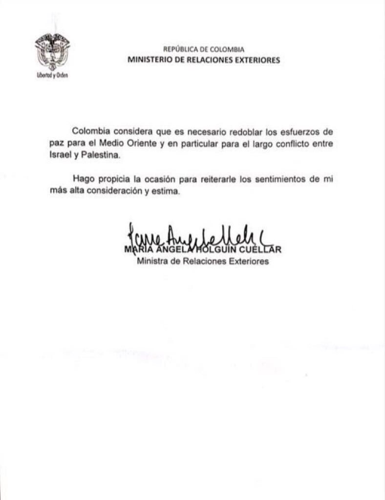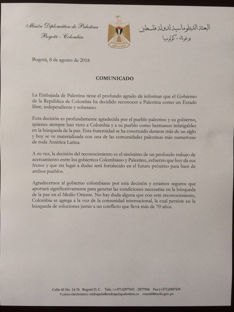 El día de ayer salió a la luz pública la información de que el gobierno del ex-presidente colombiano Juan Manuel Santos, antes de terminar su mandato, efectuó un reconocimiento de Palestina como Estado (imágenes de cartas adjuntas en este post), acción que aplaudo, especialmente porque el pueblo palestino está siendo afectado en cuanto a su libre determinación, los «asentamientos» (término eufemista) se expanden, hay abusos policiales, y la reciente ley del «Estado nación» en Israel deja mucho qué desear desde una perspectiva de la igualdad de todos los sometidos a la jurisdicción del Estado. Además, la administración Trump está aparentemente buscando recortar ayudas a refugiados palestinos por parte de terceros mediante presiones (en las que frecuentemente incurre por muchos temas), y ha reaccionado airadamente (e injustificadamente) frente a organizaciones internacionales que han aceptado a Palestina en términos de estatalidad. Pues bien, tras la revelación, el ministro de relaciones exteriores del nuevo gobierno Duque (Carlos Holmes Trujillo, teniendo el ministerio en Colombia el «flamante» título de Canciller) y la vicepresidente entrante, Marta Lucía Ramírez (probablemente con un análisis de costo-beneficio por la excesiva dependencia bilateral con los Estados Unidos), han mencionado que se examinará con detenimiento la iniciativa de la administración Santos y que se citará a la Comisión Asesora de Relaciones Exteriores para revisar el tema. Surge entonces el interrogante de si, una vez efectuado, es posible retirar el reconocimiento de un Estado efectuado por otro (sobre estos desarrollos, se puede leer aquí).